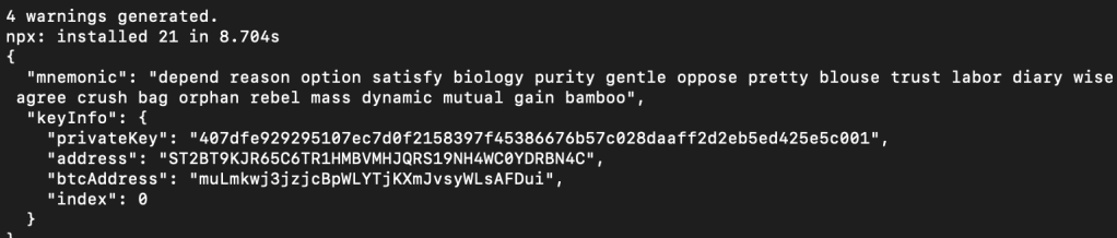 You can see I’ve got the private key, STX address (“address”), and BTC Address. (Please ignore the “warning” on the top of my screenshot).